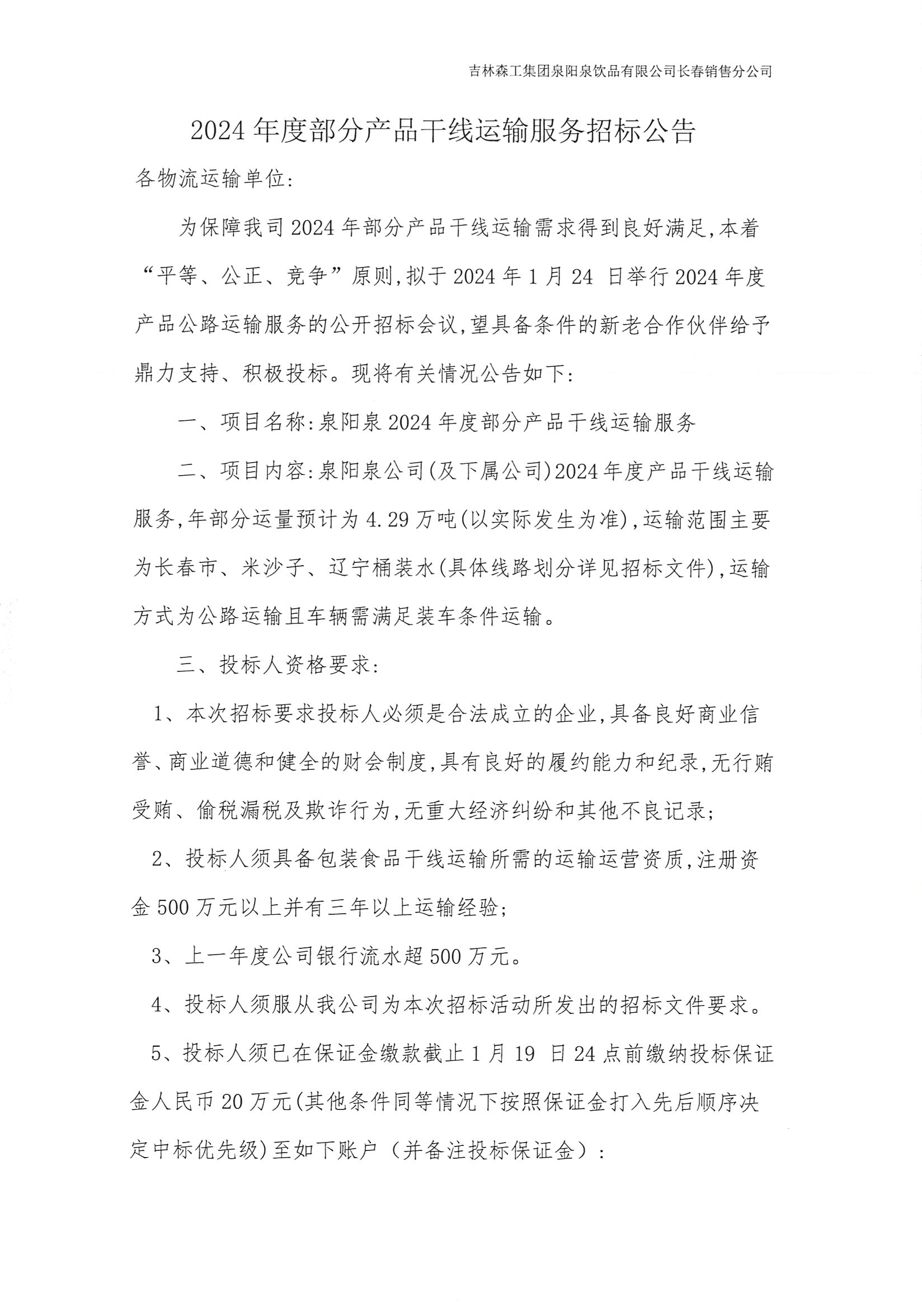 2024年度部分產(chǎn)品干線運輸服務(wù)招標(biāo)公告